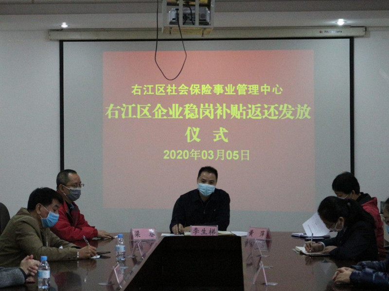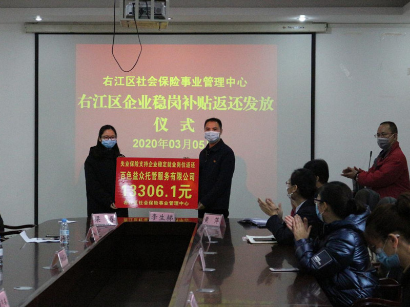 ??? 3月5日,在右江區(qū)社會保險事業(yè)管理中心召開穩(wěn)崗補(bǔ)貼返還工作會議暨企業(yè)穩(wěn)崗補(bǔ)貼返還發(fā)放儀式,我公司作為首批返還企業(yè)代表之一應(yīng)邀參加,會上社保中心主任李生梯對我公司響應(yīng)穩(wěn)崗補(bǔ)貼政策給予高度肯定,期望通過穩(wěn)崗補(bǔ)貼返還為公司的穩(wěn)定復(fù)產(chǎn)助力。截止目前,我公司有8家子公司符合享受失業(yè)保險穩(wěn)崗返還補(bǔ)貼條件,獲得穩(wěn)崗返還補(bǔ)貼3.6萬元,惠及企業(yè)員工約150人。(通訊員:黃 芬)