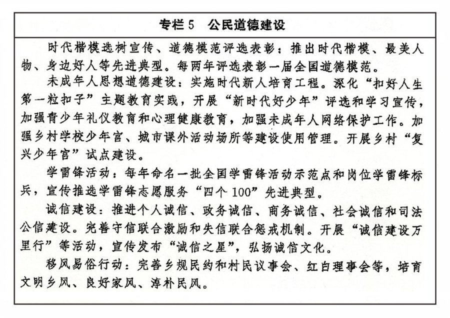 傳承弘揚中華傳統(tǒng)美德,加強(qiáng)社會公德、職業(yè)道德、家庭美德、個人品德建設(shè),加強(qiáng)家庭、家教、家風(fēng)建設(shè)。加強(qiáng)對革命、建設(shè)、改革時期各類先進(jìn)典型的學(xué)習(xí)宣傳,尊崇褒揚英雄模范,關(guān)心關(guān)愛先進(jìn)典型人物。健全家庭、學(xué)校、政府、社會相結(jié)合的思想道德教育體系,把立德樹人貫穿學(xué)校教育全過程。發(fā)揮優(yōu)秀文化產(chǎn)品陶冶道德情操的作用,完善市民公約、鄉(xiāng)規(guī)民約、學(xué)生守則、團(tuán)體章程等社會規(guī)范,廣泛開展弘揚時代新風(fēng)行動,深化道德領(lǐng)域突出問題治理。加強(qiáng)農(nóng)村思想道德建設(shè),創(chuàng)新文化科技衛(wèi)生“三下鄉(xiāng)”長效機(jī)制。