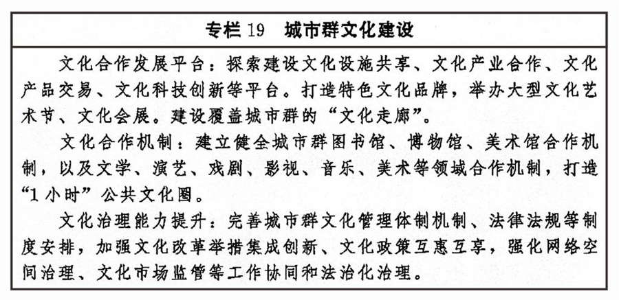 加強(qiáng)區(qū)域文化協(xié)同創(chuàng)新,健全合作互助、扶持補(bǔ)償機(jī)制,推動?xùn)|部地區(qū)以創(chuàng)新引領(lǐng)文化發(fā)展,加大力度支持中西部地區(qū)以及東北等老工業(yè)基地文化發(fā)展,扶持革命老區(qū)、民族地區(qū)、邊疆地區(qū)文化發(fā)展,形成相互促進(jìn)、優(yōu)勢互補(bǔ)、融合互動的區(qū)域文化發(fā)展格局。圍繞京津冀協(xié)同發(fā)展、長江經(jīng)濟(jì)帶發(fā)展、粵港澳大灣區(qū)建設(shè)、長三角一體化發(fā)展、黃河流域生態(tài)保護(hù)和高質(zhì)量發(fā)展等區(qū)域重大戰(zhàn)略,健全推進(jìn)區(qū)域內(nèi)文化協(xié)同發(fā)展機(jī)制,提升公共文化設(shè)施互聯(lián)互通水平,加強(qiáng)區(qū)域文化產(chǎn)業(yè)帶建設(shè),實現(xiàn)區(qū)域文化建設(shè)水平整體提高。促進(jìn)形成文化產(chǎn)業(yè)發(fā)展新格局,創(chuàng)新城市群文化一體化發(fā)展體制機(jī)制,共建高水平合作平臺,加強(qiáng)公共文化服務(wù)便利共享。完善以城帶鄉(xiāng)、城鄉(xiāng)融合的文化發(fā)展體制機(jī)制,發(fā)揮城市帶動輻射作用,加快城鄉(xiāng)間文化要素雙向流動,形成以點帶面、特色鮮明、優(yōu)勢互補(bǔ)、均衡配置的城鄉(xiāng)文化發(fā)展新格局。