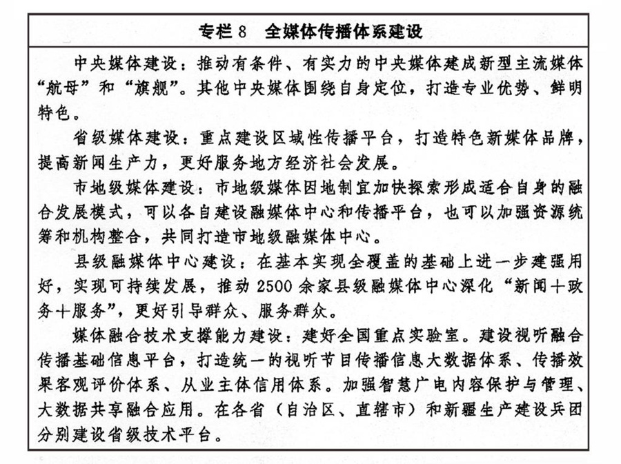 加快推進(jìn)媒體深度融合發(fā)展,有效整合各種媒介資源、生產(chǎn)要素,推動在信息內(nèi)容、技術(shù)應(yīng)用、平臺終端、管理手段等方面共融互通,打造一批具有強(qiáng)大影響力、競爭力的新型主流媒體。統(tǒng)籌處理好傳統(tǒng)媒體和新興媒體、中央媒體和地方媒體、主流媒體和商業(yè)平臺、大眾化媒體和專業(yè)性媒體的關(guān)系,建立以內(nèi)容建設(shè)為根本、先進(jìn)技術(shù)為支撐、創(chuàng)新管理為保障的全媒體傳播體系。推進(jìn)內(nèi)容生產(chǎn)供給側(cè)結(jié)構(gòu)性改革,完善高質(zhì)量內(nèi)容產(chǎn)出機(jī)制,推廣互動式、服務(wù)式、場景式傳播。強(qiáng)化新一代信息技術(shù)支撐引領(lǐng)作用,支持主流媒體重塑采編流程、建設(shè)平臺終端、優(yōu)化管理手段、強(qiáng)化版權(quán)保護(hù)、打造媒體資源數(shù)據(jù)庫、提升內(nèi)容生產(chǎn)力、占據(jù)傳播制高點。創(chuàng)新媒體業(yè)態(tài)、傳播方式和運營模式,強(qiáng)化用戶連接,發(fā)揮制度優(yōu)勢和市場作用,增強(qiáng)主流媒體競爭力。