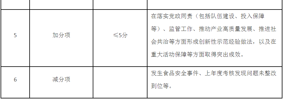 第五條 考核內容主要包括食品安全基礎工作推進、年度重點工作落實、食品安全狀況等,同時設置即時性工作評價和加減分項(考核內容要點見附件)。具體考核指標及分值在年度食品安全工作考核方案及其細則中明確,設置要科學合理,可操作、可評價、可區(qū)分,切實減輕基層負擔。