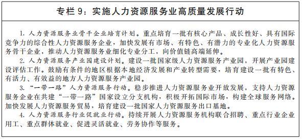 加快人力資源服務(wù)業(yè)高質(zhì)量發(fā)展。推動人力資源服務(wù)與實體經(jīng)濟融合發(fā)展,引導(dǎo)人力資源服務(wù)機構(gòu)圍繞產(chǎn)業(yè)基礎(chǔ)高級化、產(chǎn)業(yè)鏈現(xiàn)代化提供精準(zhǔn)專業(yè)服務(wù)。鼓勵人力資源服務(wù)業(yè)管理創(chuàng)新、技術(shù)創(chuàng)新、服務(wù)創(chuàng)新和產(chǎn)品創(chuàng)新,大力發(fā)展人力資源管理咨詢、高級人才尋訪、人才測評等高技術(shù)、高附加值業(yè)態(tài)。實施人力資源服務(wù)業(yè)領(lǐng)軍人才培養(yǎng)計劃。開展“互聯(lián)網(wǎng)+人力資源服務(wù)”行動。深化人力資源服務(wù)領(lǐng)域?qū)ν忾_放,探索建設(shè)國家人力資源服務(wù)出口基地。