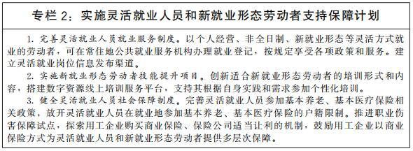 支持多渠道靈活就業(yè)和新就業(yè)形態(tài)發(fā)展。破除各種不合理限制,建立促進(jìn)多渠道靈活就業(yè)機制,支持和規(guī)范發(fā)展新就業(yè)形態(tài)。鼓勵傳統(tǒng)行業(yè)跨界融合、業(yè)態(tài)創(chuàng)新,增加靈活就業(yè)和新就業(yè)形態(tài)就業(yè)機會。加快落實《關(guān)于維護(hù)新就業(yè)形態(tài)勞動者勞動保障權(quán)益的指導(dǎo)意見》,建立完善適應(yīng)靈活就業(yè)和新就業(yè)形態(tài)的勞動權(quán)益保障制度,引導(dǎo)支持靈活就業(yè)人員和新就業(yè)形態(tài)勞動者參加社會保險,提高靈活就業(yè)人員和新就業(yè)形態(tài)勞動者社會保障水平。規(guī)范平臺企業(yè)用工,明確平臺企業(yè)勞動保護(hù)責(zé)任。健全職業(yè)分類動態(tài)調(diào)整機制,持續(xù)開發(fā)新職業(yè),發(fā)布新職業(yè)標(biāo)準(zhǔn)。