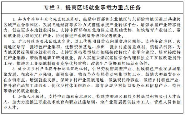 推動區(qū)域就業(yè)協(xié)調(diào)發(fā)展。支持東部地區(qū)發(fā)揮創(chuàng)新要素集聚優(yōu)勢,率先實現(xiàn)產(chǎn)業(yè)升級,開拓高質(zhì)量就業(yè)新領(lǐng)域,培育高質(zhì)量就業(yè)增長極。加快完善中西部和東北地區(qū)基礎(chǔ)設(shè)施,提升產(chǎn)業(yè)集聚區(qū)公共服務(wù)效能,引導(dǎo)產(chǎn)業(yè)向中西部和東北地區(qū)有序梯度轉(zhuǎn)移,推動就業(yè)機會向中西部和東北地區(qū)擴散。支持中西部和東北地區(qū)根據(jù)國家戰(zhàn)略導(dǎo)向和發(fā)展重點,對接先進(jìn)生產(chǎn)要素和創(chuàng)新資源,發(fā)展特色優(yōu)勢產(chǎn)業(yè),改造提升傳統(tǒng)產(chǎn)業(yè),積極布局新興產(chǎn)業(yè),厚植就業(yè)創(chuàng)業(yè)沃土。