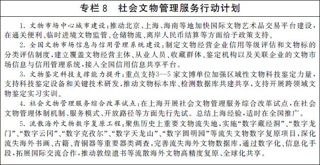 堅(jiān)持社會效益優(yōu)先,加強(qiáng)對民間收藏的指導(dǎo)、管理和服務(wù),健全文物合法流通交易體制機(jī)制,優(yōu)化文物鑒定服務(wù)和文物進(jìn)出境監(jiān)管,完善流失文物追索返還制度。