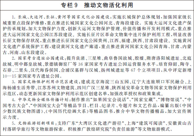 創(chuàng)新文物保護(hù)利用機(jī)制,加強(qiáng)文物和文化遺產(chǎn)保護(hù)利用,建設(shè)國家文物保護(hù)利用示范區(qū)。健全國有文物資源資產(chǎn)管理制度,推進(jìn)文物資源資產(chǎn)管理信息共享,部署開展相關(guān)試點(diǎn)工作。完善各方主體參與文物保護(hù)利用的支持政策,保障利益相關(guān)方合法權(quán)益。探索創(chuàng)新對文物資源密集區(qū)的支持方式。建設(shè)文物領(lǐng)域國家智庫。