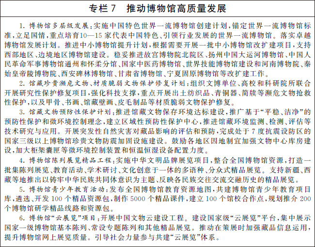 實(shí)施中國特色世界一流博物館創(chuàng)建計(jì)劃。支持省級、重要地市級博物館特色化發(fā)展。盤活基層博物館資源。探索建立行業(yè)博物館聯(lián)合認(rèn)證、共建共管機(jī)制。規(guī)范和扶持非國有博物館發(fā)展,落實(shí)支持政策,依法依規(guī)推進(jìn)非國有博物館法人財(cái)產(chǎn)權(quán)確權(quán)。認(rèn)真履行相關(guān)審批程序,有序推動建設(shè)一批反映黨和國家建設(shè)成就的當(dāng)代主題博物館和行業(yè)博物館,重點(diǎn)支持建設(shè)反映中華文明發(fā)展歷程的國家級重點(diǎn)專題博物館,倡導(dǎo)建設(shè)特色專題博物館。探索在文化資源豐厚地區(qū)建設(shè)“博物館之城”。