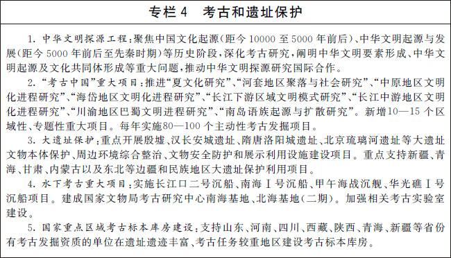 編制并實(shí)施“十四五”考古工作專項(xiàng)規(guī)劃。系統(tǒng)確定考古發(fā)掘重點(diǎn),深化中華文明探源工程,推進(jìn)“考古中國”重大項(xiàng)目,科學(xué)闡釋中國境內(nèi)人類起源、文明起源、中華文明形成、統(tǒng)一多民族國家建立和發(fā)展、中華文明在世界文明史中的重要地位等關(guān)鍵問題,揭示中華文明的歷史文化價值和核心特質(zhì)。