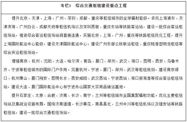 優(yōu)化綜合交通樞紐城市功能。提升國際性綜合交通樞紐的全球聯(lián)通水平和資源要素配置能力,增強(qiáng)部分樞紐國際門戶功能。優(yōu)化全國性綜合交通樞紐客貨中轉(zhuǎn)設(shè)施、集疏運(yùn)網(wǎng)絡(luò)及客運(yùn)場站間快速連接系統(tǒng)。增強(qiáng)區(qū)域性綜合交通樞紐的銜接轉(zhuǎn)運(yùn)能力,發(fā)展口岸樞紐。強(qiáng)化不同層級(jí)綜合交通樞紐城市之間功能互補(bǔ)、設(shè)施連通、運(yùn)行協(xié)同。