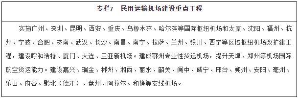 擴(kuò)大航空網(wǎng)絡(luò)覆蓋。推動(dòng)區(qū)域機(jī)場群協(xié)同發(fā)展,建設(shè)京津冀、長三角、粵港澳大灣區(qū)、成渝等世界級(jí)機(jī)場群。適時(shí)啟動(dòng)能力緊張樞紐機(jī)場改擴(kuò)建工程,強(qiáng)化樞紐機(jī)場綜合保障能力。合理加密機(jī)場布局,穩(wěn)步建設(shè)支線機(jī)場和專業(yè)性貨運(yùn)樞紐機(jī)場,提升綜合性機(jī)場貨運(yùn)能力和利用率。有序推進(jìn)通用機(jī)場規(guī)劃建設(shè),構(gòu)建區(qū)域短途運(yùn)輸網(wǎng)絡(luò),探索通用航空與低空旅游、應(yīng)急救援、醫(yī)療救護(hù)、警務(wù)航空等融合發(fā)展。優(yōu)化航路航線網(wǎng)絡(luò),加強(qiáng)軍民航空管基礎(chǔ)設(shè)施建設(shè),推廣應(yīng)用空管新技術(shù)。
