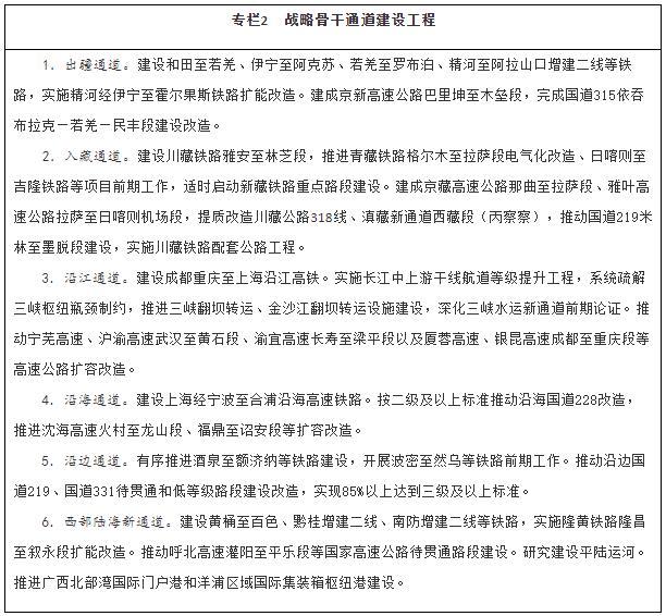 加強(qiáng)戰(zhàn)略骨干通道建設(shè)。推進(jìn)出疆入藏通道建設(shè),擴(kuò)大甘新、青新、青藏、川藏四條內(nèi)聯(lián)主通道通行能力,穩(wěn)步推進(jìn)川藏鐵路建設(shè),加快推進(jìn)新藏鐵路和田至日喀則段前期工作、適時(shí)啟動(dòng)重點(diǎn)路段建設(shè),有序推進(jìn)滇藏鐵路前期工作,密實(shí)優(yōu)化航空航線網(wǎng)絡(luò)布局,構(gòu)建多向聯(lián)通的通道布局。暢通沿江通道,加快建設(shè)沿江高鐵,優(yōu)化以高等級(jí)航道和干線鐵路、高速公路為骨干的沿江綜合運(yùn)輸大通道功能。升級(jí)沿海通道,提高鐵路通道能力,推進(jìn)高速公路繁忙路段擴(kuò)容改造,提升港口航道整體效能,構(gòu)建大容量、高品質(zhì)的運(yùn)輸走廊。貫通沿邊通道,提級(jí)改造普通國省干線,推進(jìn)重點(diǎn)方向沿邊鐵路建設(shè),提高安全保障水平。建設(shè)西部陸海新通道,發(fā)揮鐵路在陸路運(yùn)輸中的骨干作用和港口在海上運(yùn)輸中的門戶作用,強(qiáng)化東、中、西三條通路,形成大能力主通道,銜接國際運(yùn)輸通道。