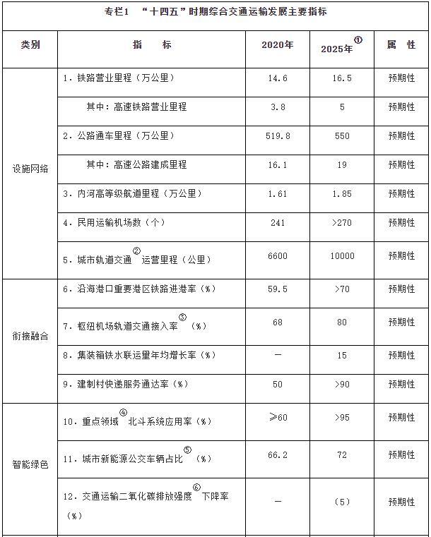 注:①〔〕內(nèi)為5年累計(jì)數(shù)。②指納入國家批準(zhǔn)的城市軌道交通建設(shè)規(guī)劃中的大中運(yùn)量城市軌道交通項(xiàng)目。③指國際樞紐機(jī)場和區(qū)域樞紐機(jī)場中連通軌道交通的機(jī)場數(shù)量占比。④指重點(diǎn)營運(yùn)車輛、郵政快遞自有干線運(yùn)輸車輛、應(yīng)安裝具備衛(wèi)星定位功能船載設(shè)備的客船及危險(xiǎn)品船等。⑤指新能源公交車輛占所有地面公交車輛的比重。⑥指按單位運(yùn)輸周轉(zhuǎn)量計(jì)算的二氧化碳排放。