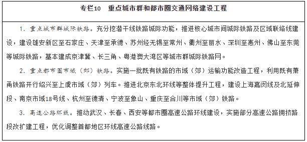 強(qiáng)化重點(diǎn)城市群城際交通建設(shè)。圍繞京津冀、長三角、粵港澳大灣區(qū)、成渝、長江中游等城市群,以軌道交通、高速公路為骨干,提升城際運(yùn)輸通道功能,加強(qiáng)核心城市快速直連,構(gòu)建多節(jié)點(diǎn)、網(wǎng)絡(luò)化的城際交通網(wǎng),實(shí)現(xiàn)城市群內(nèi)主要城市間2小時(shí)通達(dá)。整體推進(jìn)京津冀、長三角、粵港澳大灣區(qū)城際鐵路和市域(郊)鐵路建設(shè),有序推動(dòng)成渝地區(qū)雙城經(jīng)濟(jì)圈城際鐵路和市域(郊)鐵路建設(shè),加強(qiáng)與高速鐵路、普速鐵路一體銜接,擴(kuò)大對(duì)5萬人口以上城鎮(zhèn)的有效覆蓋。