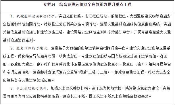 健全綜合交通運(yùn)輸應(yīng)急管理體制機(jī)制,完善應(yīng)急協(xié)調(diào)機(jī)制和應(yīng)急預(yù)案體系,加強(qiáng)交通運(yùn)輸調(diào)度與應(yīng)急指揮平臺(tái)建設(shè)。推進(jìn)區(qū)域性公路應(yīng)急裝備物資儲(chǔ)備中心建設(shè)。加強(qiáng)水上交通安全監(jiān)管、航海保障和救助打撈能力建設(shè),完善沿海和內(nèi)河溢油應(yīng)急設(shè)備庫,構(gòu)建陸??仗煲惑w化水上交通運(yùn)輸安全保障體系。建設(shè)城市軌道交通應(yīng)急演練中心。以骨干航空物流企業(yè)為主體構(gòu)建航空應(yīng)急服務(wù)網(wǎng)絡(luò)。建設(shè)海事監(jiān)管指揮系統(tǒng)。在開展城市交通基礎(chǔ)設(shè)施地下空間、低洼區(qū)域、重點(diǎn)區(qū)段、重要點(diǎn)位、關(guān)鍵設(shè)施等隱患排查基礎(chǔ)上,建立健全風(fēng)險(xiǎn)臺(tái)賬和災(zāi)害隱患清單,補(bǔ)齊設(shè)施設(shè)備、應(yīng)急搶險(xiǎn)物資等短板,持續(xù)完善應(yīng)急處置預(yù)案,健全應(yīng)急響應(yīng)機(jī)制,提升應(yīng)對(duì)極端天氣能力。加強(qiáng)應(yīng)急專業(yè)隊(duì)伍和志愿者隊(duì)伍建設(shè),充實(shí)國家應(yīng)急運(yùn)輸儲(chǔ)備力量。健全應(yīng)對(duì)重大疫情、防范應(yīng)對(duì)恐怖襲擊、保障信息安全等非傳統(tǒng)安全應(yīng)急指揮體系和應(yīng)急交通組織。