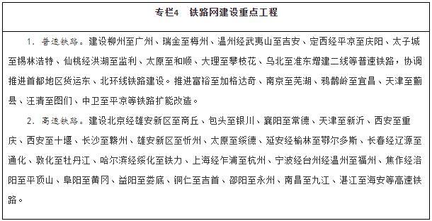 建設(shè)現(xiàn)代化鐵路網(wǎng)。堅(jiān)持客貨并重、新建改建并舉、高速普速協(xié)調(diào)發(fā)展,加快普速鐵路建設(shè)和既有鐵路擴(kuò)能改造,著力消除干線瓶頸,推進(jìn)既有鐵路運(yùn)能緊張路段能力補(bǔ)強(qiáng),加快提高中西部地區(qū)鐵路網(wǎng)覆蓋水平。加強(qiáng)資源富集區(qū)、人口相對(duì)密集脫貧地區(qū)的開發(fā)性鐵路和支線鐵路建設(shè)。推進(jìn)高速鐵路主通道建設(shè),提升沿江、沿海、呼南、京昆等重要通道以及京滬高鐵輔助通道運(yùn)輸能力,有序建設(shè)區(qū)域連接線。綜合運(yùn)用新技術(shù)手段,改革創(chuàng)新經(jīng)營管理模式,提高鐵路網(wǎng)整體運(yùn)營效率。統(tǒng)籌考慮運(yùn)輸需求和效益,合理規(guī)劃建設(shè)鐵路項(xiàng)目,嚴(yán)控高速鐵路平行線路建設(shè)。