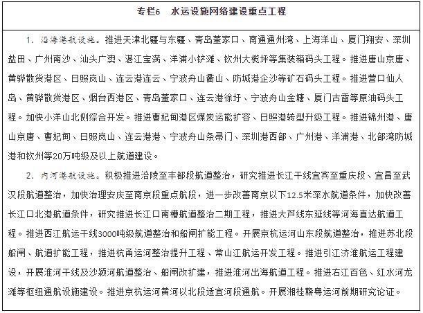 優(yōu)化暢通水運(yùn)設(shè)施網(wǎng)絡(luò)。建設(shè)京津冀、長三角、粵港澳大灣區(qū)世界級(jí)港口群,支持山東打造世界一流的海洋港口,推進(jìn)東北地區(qū)沿海港口一體化發(fā)展,優(yōu)化港口功能布局,推動(dòng)資源整合和共享共用。有序推進(jìn)沿海港口專業(yè)化碼頭及進(jìn)出港航道等公共設(shè)施建設(shè)。適度超前建設(shè)糧食、能源、礦產(chǎn)資源的接卸、儲(chǔ)存、中轉(zhuǎn)設(shè)施,推進(jìn)沿海沿江液化天然氣碼頭規(guī)劃建設(shè)。提升內(nèi)河港口專業(yè)化、規(guī)?;?,合理集中布局集裝箱、煤炭、鐵礦石、商品汽車等專業(yè)化碼頭。加強(qiáng)內(nèi)河高等級(jí)航道擴(kuò)能升級(jí)與暢通攻堅(jiān)建設(shè),完善長江、珠江、京杭運(yùn)河和淮河等水系內(nèi)河高等級(jí)航道網(wǎng)絡(luò),進(jìn)一步提升珠三角高等級(jí)航道網(wǎng)出海能力,全面加強(qiáng)長三角、珠江—西江高等級(jí)航道網(wǎng)未達(dá)標(biāo)段建設(shè)。推動(dòng)重要支流航道和庫湖區(qū)航道、內(nèi)河旅游航道、便民碼頭建設(shè)。