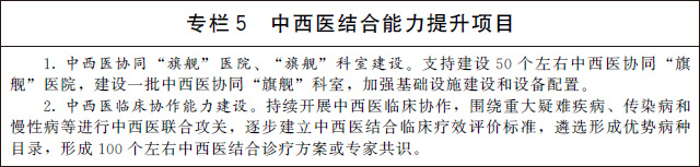 推動(dòng)綜合醫(yī)院中西醫(yī)協(xié)同發(fā)展。在綜合醫(yī)院推廣“有機(jī)制、有團(tuán)隊(duì)、有措施、有成效”的中西醫(yī)結(jié)合醫(yī)療模式,將中醫(yī)納入多學(xué)科會(huì)診體系,加強(qiáng)中西醫(yī)協(xié)作和協(xié)同攻關(guān),制定實(shí)施“宜中則中、宜西則西”的中西醫(yī)結(jié)合診療方案。將中西醫(yī)協(xié)同發(fā)展工作納入醫(yī)院評(píng)審和公立醫(yī)院績(jī)效考核。推動(dòng)三級(jí)綜合醫(yī)院全部設(shè)置中醫(yī)臨床科室,設(shè)立中醫(yī)門(mén)診和中醫(yī)病床。打造一批中西醫(yī)協(xié)同“旗艦”醫(yī)院、“旗艦”科室,開(kāi)展重大疑難疾病、傳染病、慢性病等中西醫(yī)聯(lián)合攻關(guān)。