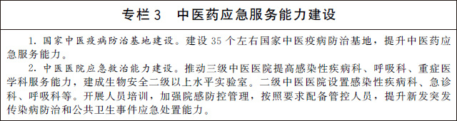 加強(qiáng)中醫(yī)藥應(yīng)急救治能力建設(shè)。依托高水平三級(jí)甲等中醫(yī)醫(yī)院,建設(shè)覆蓋所有省份的國(guó)家中醫(yī)疫病防治基地,依托基地組建中醫(yī)疫病防治隊(duì)伍,提升中醫(yī)緊急醫(yī)學(xué)救援能力。三級(jí)公立中醫(yī)醫(yī)院和中西醫(yī)結(jié)合醫(yī)院(不含中醫(yī)專(zhuān)科醫(yī)院)全部設(shè)置發(fā)熱門(mén)診,加強(qiáng)感染性疾病、急診、重癥、呼吸、檢驗(yàn)等相關(guān)科室建設(shè),提升服務(wù)能力。