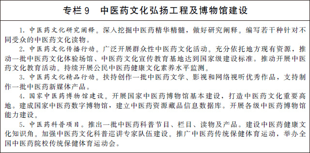 2.發(fā)展中醫(yī)藥博物館事業(yè)。開(kāi)展國(guó)家中醫(yī)藥博物館基本建設(shè),建成國(guó)家中醫(yī)藥數(shù)字博物館。促進(jìn)中醫(yī)藥博物館體系建設(shè),強(qiáng)化各級(jí)各類(lèi)中醫(yī)藥博物館收藏研究、社會(huì)教育、展覽策劃和文化服務(wù)功能,加強(qiáng)數(shù)字化建設(shè),組織內(nèi)容豐富的中醫(yī)藥專(zhuān)題展覽。